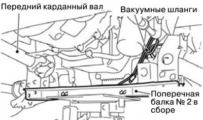 2) Опустить поперечную балку № 2, так чтобы появилась возможность для снятия переднего карданного вала.