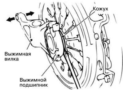 Примечание. Выжимная вилка переместиться в направлении В, под действием возвратной пружины, после снятия выжимного подшипника.