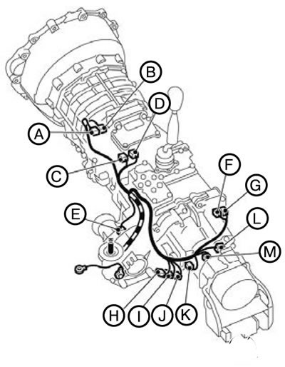 2) Расположить отсоединенную электропроводку коробки передач, так же как она расположена на транспортном средстве.