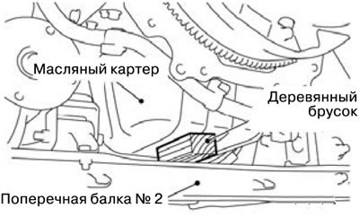Внимание. Поместить деревянный брусок между поперечной балкой № 2 и масляным картером двигателя, чтобы зафиксировать двигатель и предотвратить его повреждения при снятии коробки передач.