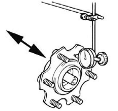 4. Если осевой зазор превышает предельно допустимое значение, заменить ступицу заднего колеса в сборе.