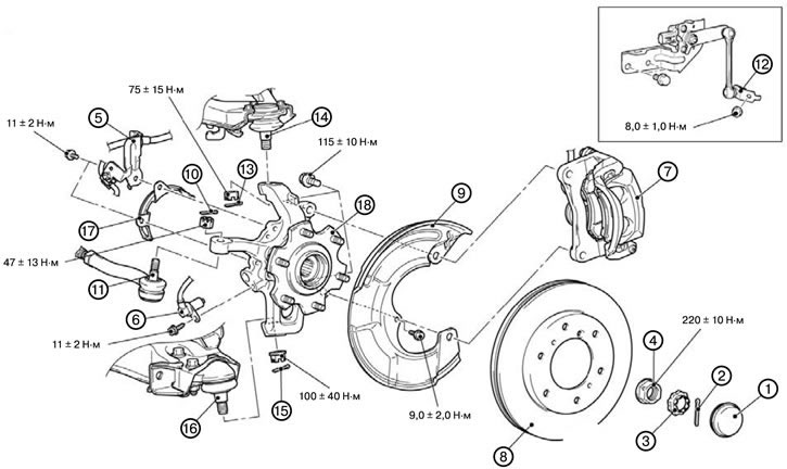 14. Отсоединить соединение верхнего рычага подвески, ступицы и поворотного кулака в сборе (14).
