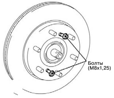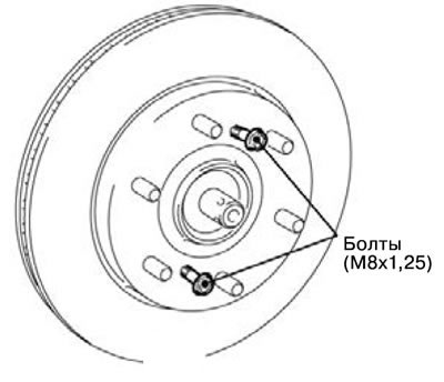 Примечание. Если снятие тормозного диска затруднено, установить болты М8х1,25, как показано на рисунке, и снять тормозной диск, завернув установленные болты.
