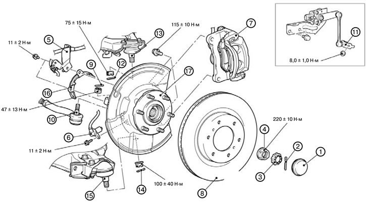 11. Отсоединить соединение наконечника рулевой тяги, ступицы и поворотного кулака в сборе (11).