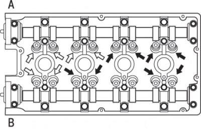 Рис. 3.7. При установке поршня 1-го цилиндра в ВМТ проверьте работу гидрокомпенсаторов, указанных белыми стрелками, а после установки поршня 4-го цилиндра в ВМТ проверьте работу гидрокомпенсаторов, указанных черными стрелками: А – сторона впускных клапанов; В – сторона выпускных клапанов