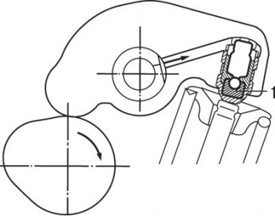 - если при нажатии коромысло клапана легко опускается, когда профиль кулачка находится в положении закрытого клапана, как показано на рис. 3.8, гидрокомпенсатор неисправен и требует замены. При замене гидрокомпенсаторов удалите из них воздух и снова проверьте их состояние;