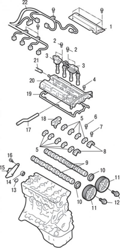 Рис. 3.15. Распределительные валы и сальники распределительного вала двигателя DOHC: 1 – центральная крышка; 2 – болты, 10 Н·м; 3 – катушка зажигания в сборе; 4 – болт, 3,4 Н·м; 5 – крышка подшипника распределительного вала; 6 – болт, 10–12 Н·м; 7 – болт, 21–25 Н·м; 8 – передние крышки подшипников распределительных валов; 9 – распределительные валы; 10 – сальник распределительного вала; 11 – шкив распределительного вала; 12 – болты, 88 Н·м; 13 – полукруглая заглушка; 14 – кольцевое уплотнение; 15 – датчик неисправности системы зажигания в сборе; 16 – болт, 12–15 Н·м; 17 – патрубок системы принудительной вентиляции картера (PCV); 18 – задняя крышка подшипника распределительного вала; 19 – прокладка крышки головки блока цилиндров; 20 – крышка головки блока цилиндров; 21 – соединение шланга вентиляции картера; 22 – жгут проводов системы управления двигателем