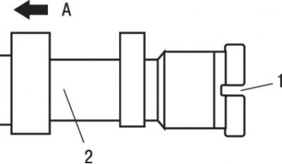 Рис. 3.17. Расположение паза на распределительном валу выпускных клапанов: А – сторона шкива распределительного вала; 1 – паз; 2 – распределительный вал выпускных клапанов