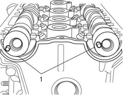 Рис. 3.18. Расположение установочных штифтов (1) при установке распределительных валов