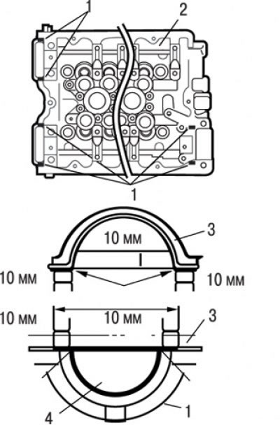 Рис. 3.20. Места нанесения герметика на головку блока цилиндров: 1 – места нанесения герметика ЗМ ATD Part №8660; 2 – головка блока цилиндров; 3 – прокладка крышки головки блока цилиндров; 4 – полукруглая заглушка