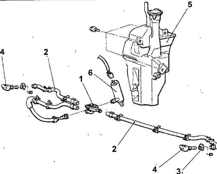 Рис. 17.78. Омыватель фар: 1 - напорный клапан; 2 - шланг омывателя; 3 - кронштейн, 4 - распылитель; 5 - бачок; 6 - насос омывателя