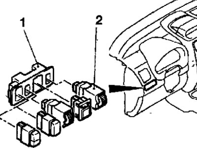 Рис. 19.98. Реостат регулировки яркости подсветки панели приборов: 1 - декоративная облицовка переключателей; 2 - реостат регулировки яркости подсветки панели приборов