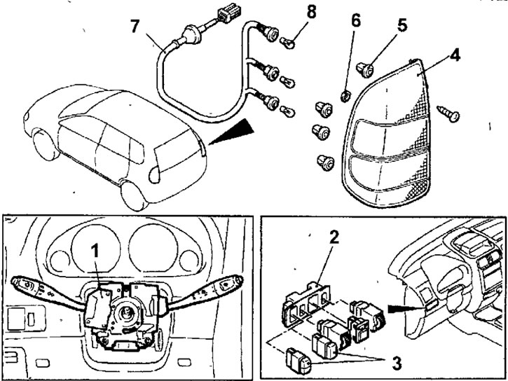 Рис. 19.96. Задний комбинированный фонарь: 1 - многофункциональный под-рулевой переключатель (с переключателем освещения и поворота); 2 - декоративная облицовка переключателей; 3 - выключатель противотуманных фонарей; 4 - задний комбинированный фонарь; 5 - насадка; 6 - уплотняющее кольцо; 7 - жгут проводов с патронами; 8 - лампа